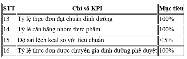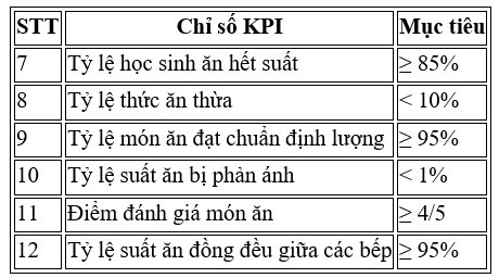 • Tỷ lệ suất ăn đạt chuẩn ≥ 95%